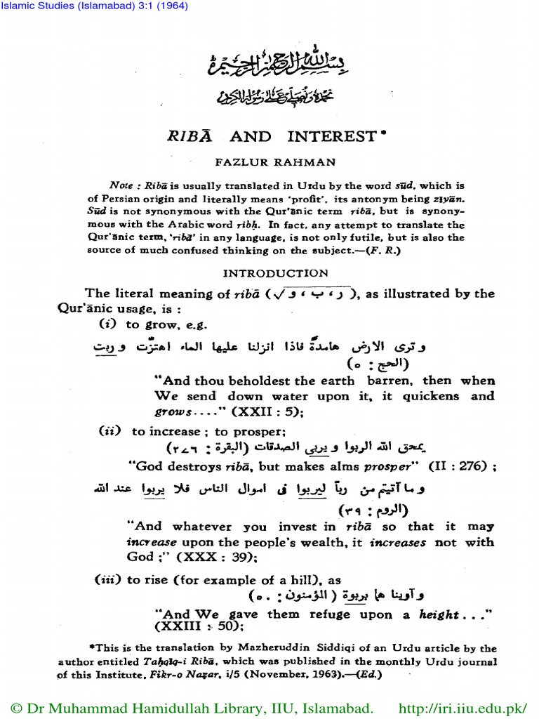 Riba And Interest Fazlur Rahman Usury Muhammad