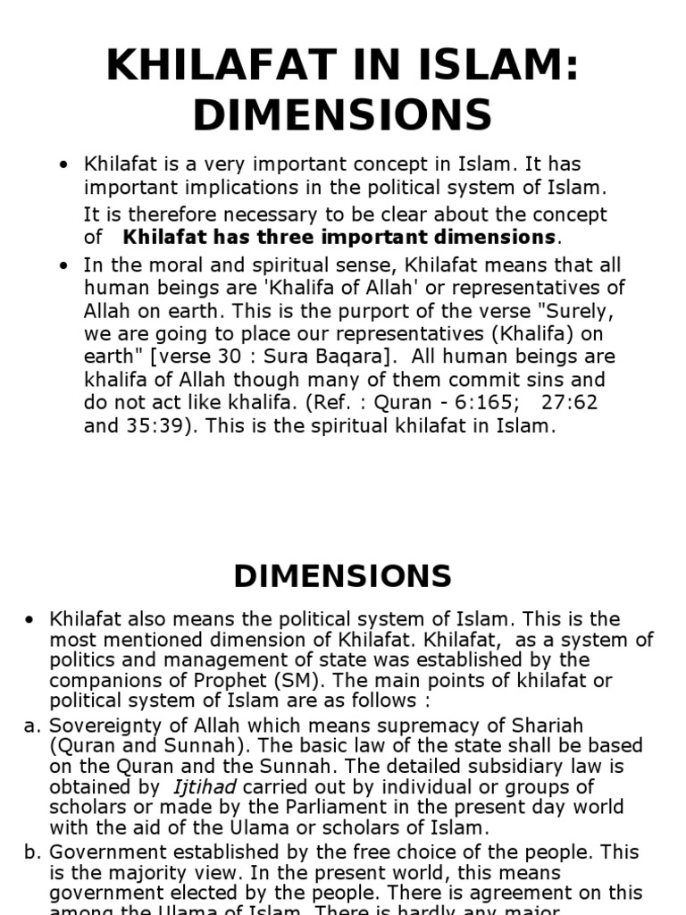THE ISLAMIC CONCEPT OF CALIPHATE. BASIC PRINCIPLES AND A CONTEMPORARY INTERPRETATION This article studies the approach of Islamic legal thought to the idea of Caliphate. In the moral and spiritual sense Khilafat means that all human beings are Khalifa of Allah or representatives of.